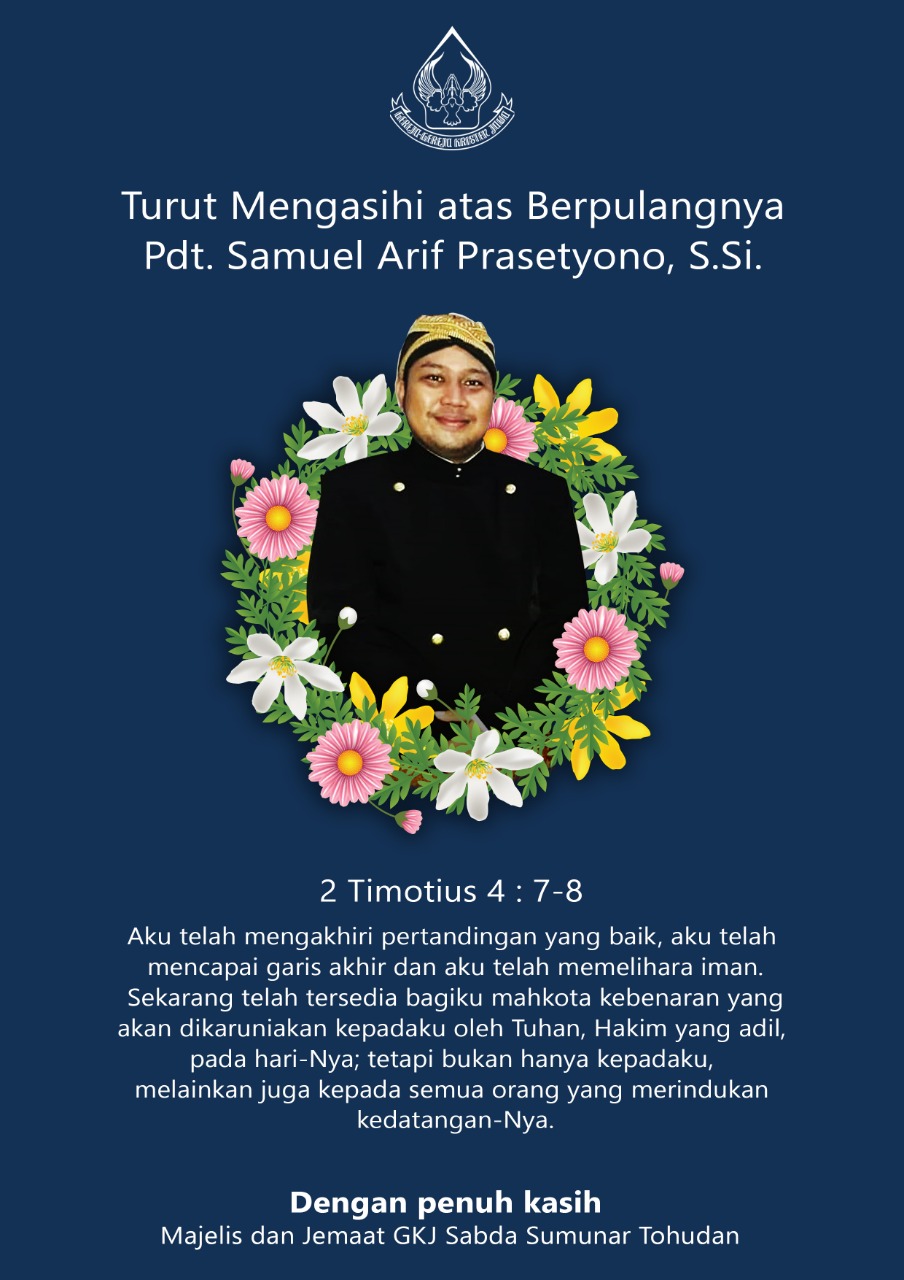 Majelis GKJ Sabda Sumunar Tohudan mengucapkan turut berdukacita atas berpulangnya Bp. Pdt. Samuel Arif Prasetyono, S.Si ke rumah Bapa di Sorga pada hari Senin, 11 Januari 2021 jam 21.15 WIB