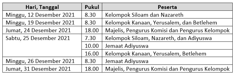Jadwal pelaksanaan Ibadah di gereja selama bulan Desember 2021 adalah sebagai berikut